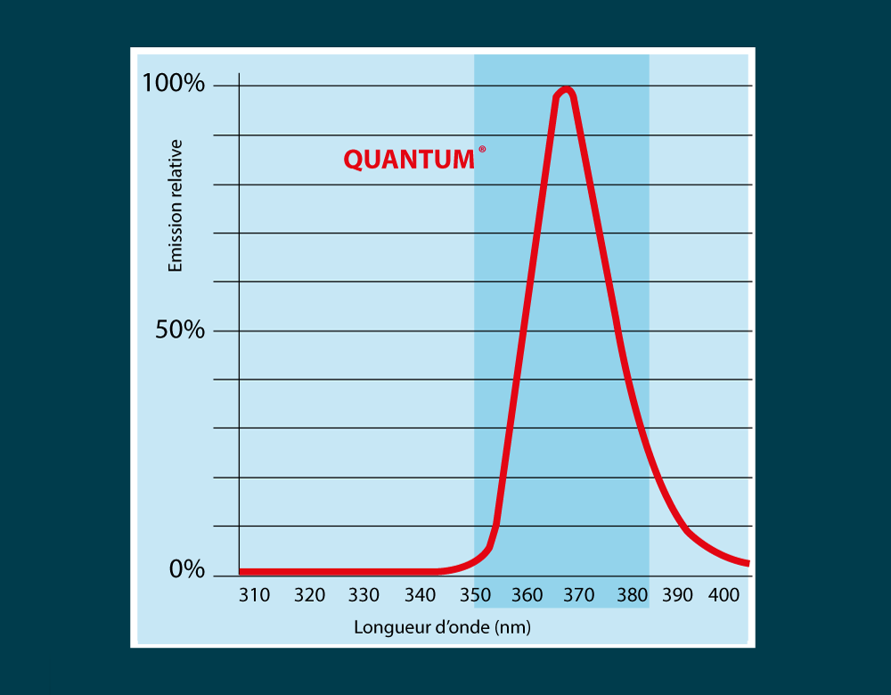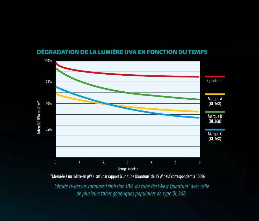 L’émission UVA du tube dépend fortement des types de phosphores utilisés et de la qualité du processus de fabrication. Un mélange de phosphores inadapté ou un manquement même minime dans le contrôle qualité conduit à un produit très peu performant. Le mélange de phosphores spécifique utilisé dans les tubes Quantum® et un contrôle qualité selon les normes internationales permettent la production de tubes dotés d’une forte émission UVA initiale. De plus, cette émission est maintenue à un niveau élevé pendant toute la durée de vie du tube (voir graphique ci-dessous). Par conséquent, les tubes PestWest Quantum® garantissent à l’utilisateur une grande efficacité durant l’intégralité de leur fonctionnement.